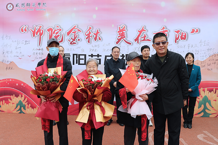 活动中,校领导、文科社区负责人为年满90岁的老师和银龄奖老师献花,送上节日的祝福,离退休职工登高游园、签名留影。