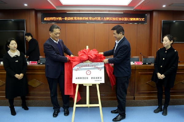 仪式上,王长顺与乾县副县长王军战为“咸阳师范学院-乾县教育局教师教育协同育人创新实验区”揭牌。
