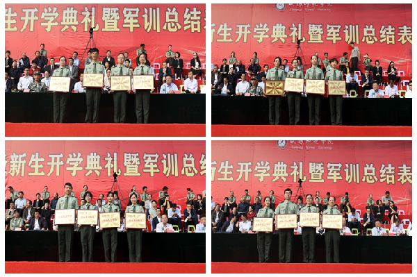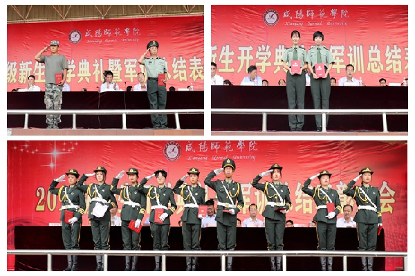 王长顺宣读了《咸阳师范学院2019级新生军训先进集体和先进个人表彰决定》。音乐学院等4个学院被评为“军训歌咏比赛先进集体”,物理与电子工程学院等4个学院被评为“军训内务先进集体”,文学与传播学院等4个学院被评为“军训会操先进集体”,马克思主义学院等4个学院被评为“疏散演练先进集体”;军训团一营、四营、六营被评为“军训最具人气营队”;吴金锁等12名教官被评为“军训优秀教官”,穆武超等8名辅导员被评为“优秀指导员”,陈奕文等4名辅导员被评为“军训网络宣传先进个人”;白雪等45名同学被评为“军训标兵”,史静等180名同学被评为“军训先进个人”。学校领导和承训部队领导为先进集体和个人颁发了奖牌和证书。文学与传播学院播音与主持艺术专业 1901班学生陈婷婷和职业技术学院计算机应用专业贺紫涵分别代表新生作了发言。