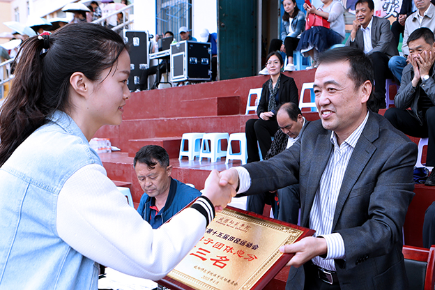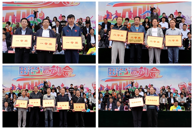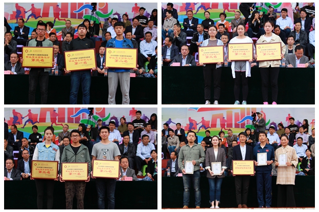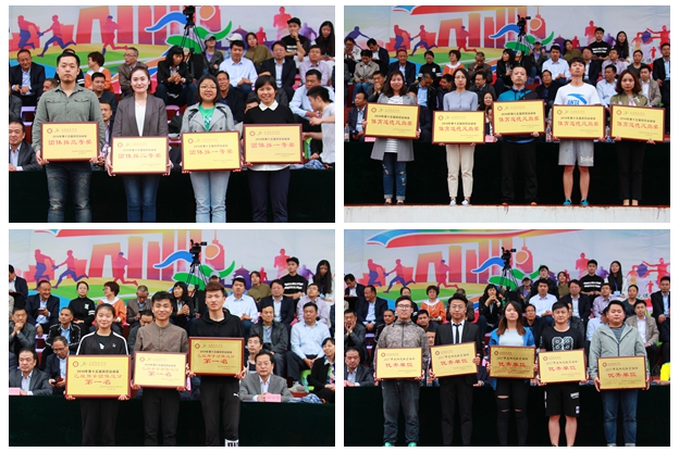 经过三天紧张激烈的角逐,资源环境与历史文化学院、数学与信息科学学院、物理与电子工程学院代表队分别获得甲组团体总分前三名;物理与电子工程学院、资源环境与历史文化学院、职业技术学院代表队分别获得甲组男子团体前三名,数学与信息科学学院、资源环境与历史文化学院、化学与化工学院代表队分别获得甲组女子团体前三名。体育学院2017级代表队获得乙组团体、乙组男子团体、乙组女子团体第一名。设计学院、资源环境与历史文化学院、数学与信息科学学院、美术学院(于右任书法学院)、物理与电子工程学院被评为2017年度阳光体育先进单位。校工会《魅力太极》、经济与管理学院《舞韵韶华》获得团体操表演一等奖,音乐学院《爱我中华》获得团体操表演二等奖,美术学院《炫舞青春》获得团体操表演三等奖,体育学院校友会与宝鸡猴哥快乐家族教育咨询有限公司获得团体操优秀组织奖。李江平、于艳、蒋荆子、张艺伟获得“团体操优秀教练员”称号。文学与传播学院、化学与化工学院、教育科学学院、体育学院、外国语学院代表队获得“体育道德风尚奖”。在教职工趣味运动项目中,体育学院分会、机关一分会、文学与传播学院分会获得团体一等奖,物理与电子工程学院分会、附属中学分会、职业技术学院分会、机关二分会获得团体二等奖,计算机学院分会、政治与社会学学院分会、后勤处(集团)分会、化学与化工学院分会、数学与信息科学学院分会获得团体三等奖,设计学院分会、经济与管理学院分会获得“优秀组织奖”。与会部分领导为获奖的代表队颁发了奖杯、奖牌。