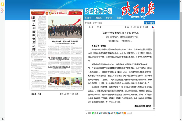 3月5日,《陕西日报》刊登了陕报驻两会记者对全国政协委员、我校校长方明的采访报道。该报道称,方校长建议,国家应加大对地方院校,特别是师范院校的支持力度,在地方师范院校设立免费师范生项目,吸引更多优秀考生报考。该篇新闻被陕西省教育厅官网转载。