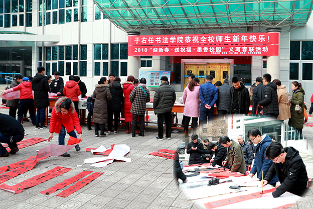 为弘扬传统文化,增添新春佳节喜庆,给全校师生送上节日祝福,1月18日,由我校党委组织部、党委宣传部、校工会、学工部、团委主办,于右任书法学院承办的2018年“迎新春、送祝福、墨香校园”义写春联活动在学馨苑广场火热进行。