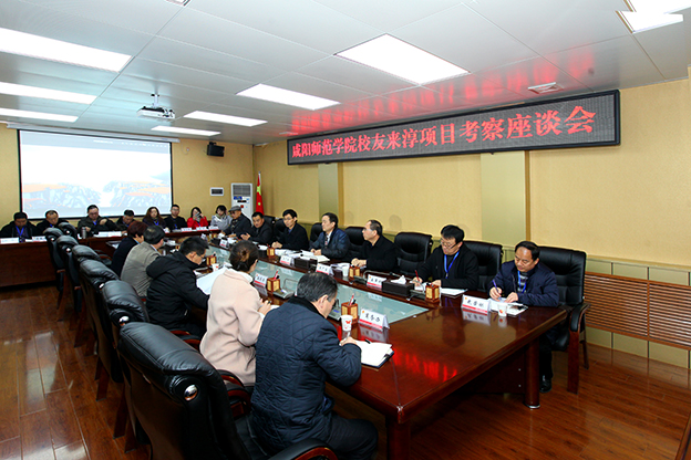 吕副校长介绍了我校的基本情况,说明了“双百工程”的重要性。他指出,结对帮扶工作得到了淳化县委、县政府及县上各部门的高度重视和大力支持,我校前期在淳化县开展了“露地西红柿种植中后期管理实用技术培训班”“电子商务培训班”“短缺学科培训 ”“爱心妈妈”等培训活动,组织了“关爱留守儿童青年志愿者活动”,建立了旅游产业产学研示范基地和电子商务产学研示范基地,组建了由我校专家、教授、博士组成的“淳化县发展研究团队”,制定了《咸阳师范学院结对帮扶淳化县县域经济发展调查研究工作方案》,切实将淳化县扶贫工作落到实处。此次组成校友投资考察团,在淳化县和我校校友、企业之间搭建起合作共建的桥梁,充分发挥我校校友在资金、技术、市场、管理、人脉等方面的优势,提供资源开发、市场开拓、合作共建、慈善捐赠等多种方式,找准精准帮扶的切入点,为助力淳化县脱贫攻坚做出贡献。吕副校长对校友积极参与结对帮扶、支持母校扶贫工作表示感谢。
