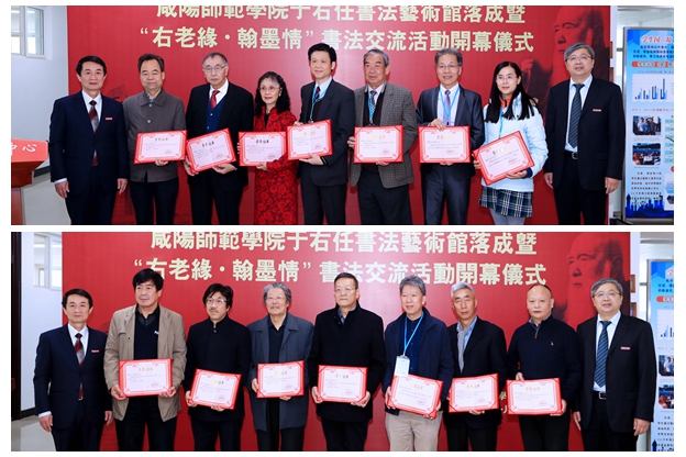 党委书记刘彬、校长方明向为于右任书法艺术馆建设作出突出贡献的钟明善、于中令、祁硕森、鲁光宏等23位专家学者、收藏家、企业家颁发了捐赠证书和收藏荣誉证书。于中令先生赠予我校于右任书法高仿精品《第二次大战回忆歌》十米长卷一幅,并签约借予我校于右任《百字令题标准草书》真迹一件两页,在我校于右任书法艺术馆展出,供师生研究学习。