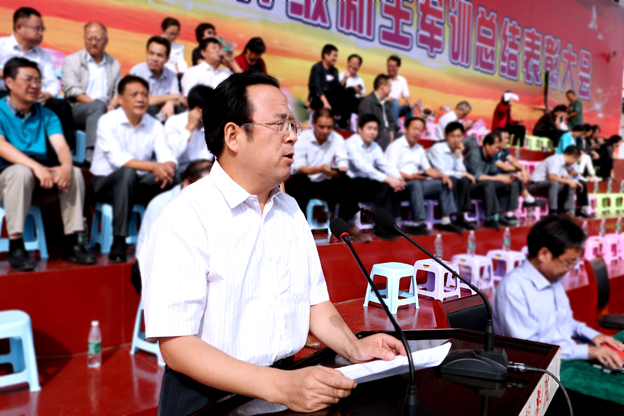 李副书记作了讲话,他代表学校对中国人民解放军陕西陆军高炮师四团领导和全体承训教官表示衷心的感谢,向辛勤工作在军训第一线的各位同志表示亲切的问候,向圆满完成军训任务的2017级全体同学以及受表彰的先进集体和个人表示热烈祝贺。李副书记指出,军训工作虽然很辛苦,但同学们的身体得到了锤炼,意志得到了磨砺,达到了军训的目的。他希望同学们保持军训成果的同时向他们提出了四点希望和要求:一是希望同学们继续保持军训中形成的顽强拼搏、勇于挑战的精神,以饱满的热情投入专业学习之中,在学习目标、形态、动机三个方面实现新的转变;二是希望同学们继续保持军训执行中表现出的严谨态度和勤学善思优良作风,以科学的学习方法投入到专业学习之中,在学习能力、创新创造能力、解决实际问题能力三个方面实现新的突破;三是希望同学们继续保持军训中形成的深厚友谊和团结奋进的集体主义精神,在同学之情、师生之情、集体之情三个方面实现新的发展;四是希望同学们继续保持军训中形成的铁的纪律和优良作风与品格,在文明礼貌、道德情操、为人处事三个层面实现新的提升。