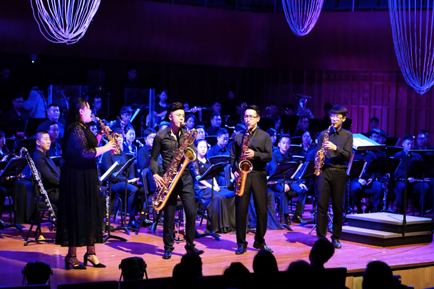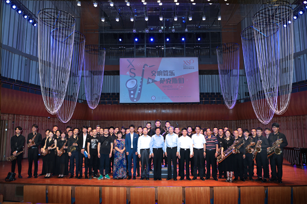 这是一次萨克斯管乐与交响管乐的艺术碰撞,这是一次萨克斯管乐与交响管乐的交融之旅,这是一次以萨克斯管乐与交响管乐演绎大众耳熟能详的经典动漫与电影配乐的新尝试,这是一场令人心动的音乐会,这是由我校音乐学院八音萨克斯管乐团与西安交响乐团于5月19日晚在曲江西安音乐厅,为西咸两市人民呈现的雅俗共赏、形式新颖的“交响管乐与萨克斯们”专场音乐会。本场音乐会吸引了来自西咸两市近千名市民观看,我校校长方明,党委副书记马智勇,纪委书记王启和,副校长舒世昌、毛龙灿前往观看了演出。