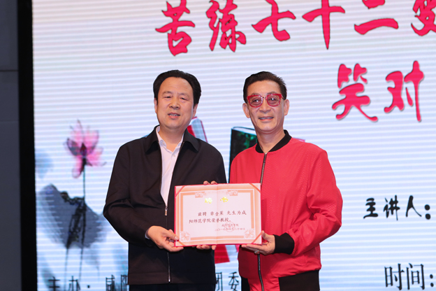 校团委书记宁海军主持了讲座。校党委副书记李宗领代表学校党政和全体师生对六小龄童的到来表示热烈欢迎和衷心的感谢,他讲道,央视版《西游记》是一部公认的无法超越的经典,六小龄童所打造的孙悟空形象迄今已经融入了绝大部分国人的脑海之中,成为了不可超越的巅峰形象和人们心中永恒的偶像。近年来,六小龄童致力于中华优秀传统文化的传播,希望通过自身历经苦难的艺术生涯和对艺术的不懈追求,启发大学生奋发向上,努力拼搏,成就属于自己的美好人生。随后,李副书记为六小龄童颁发了我校“荣誉教授”证书,并赠送了礼品。