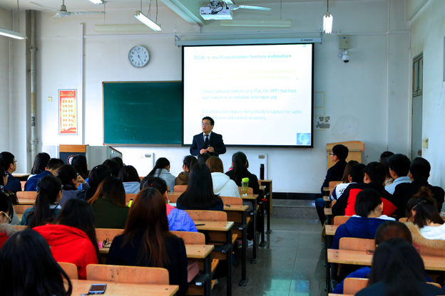 报告中,Han教授围绕计算机与信息技术在组学数据中的应用这一主题,向大家介绍了大数据分析在疾病检测中的国内外研究现状以及常用算法流程,详细讲解了近几年来自己在应用大数据诊断肿瘤方面做出的重要研究成果——DCA(微分组份分析)方法。Han教授的算法新颖独特、效率高,可以将复杂的大数据降维,并实现线性可分,对诊断肿瘤疾病具有很好的检测效果。报告结束后,Han教授还就报告内容及出国留学等问题与学生进行了深入交流。