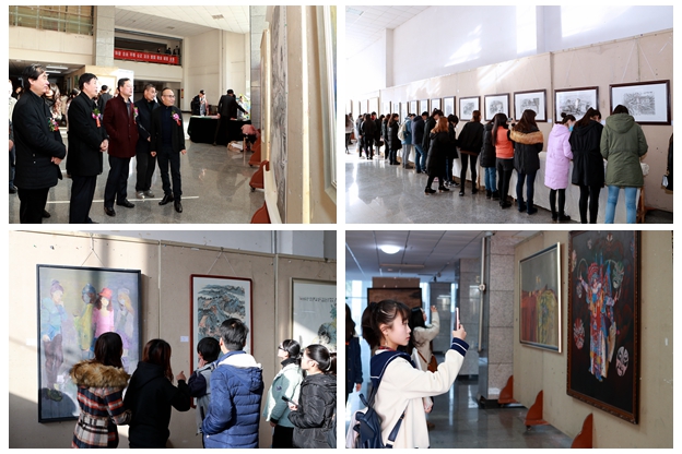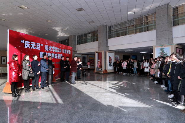 开幕式上,舒世昌副校长致辞。他谈道,这次展览既是我校美术学院实践教学成果展,也是学校喜迎新年的美术作品展。展览既弘扬社会主义核心价值观,又营造了高雅和谐、健康向上的校园文化育人氛围,展示师生厚德博学、励志进取的精神风貌。希望美术学院师生以习近平总书记在全国文艺工作座谈会和高校思想政治工作会议上的讲话精神为指导,坚持艺术为人民,尊重艺术发展规律,并以此次展览为契机,不断提高教育教学质量和艺术修养。随后,咸阳市文联党组书记贾黎明先生,咸阳市美术家协会主席成中艾先生先后发表了热情洋溢的讲话,在肯定美术学院师生刻苦钻研、勇于创新的创作实践的同时,他们鼓励同学们要广泛深入生活,努力锻造艺术修养与专业技能,更好的创作出人民喜闻乐见的艺术作品。