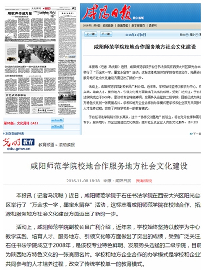 11月8日,《咸阳日报》以“咸阳师范学院校地合作服务地方社会文化建设”为题,报道了我校于右任书法学院在西安大兴区阳光台365小区举行了“万金求一字,墨宝永留存”活动,这标志着我校在校地合作、拓展资源和服务地方社会文化建设方面迈出了新的一步。随后,光明网教育频道等多家媒体对这一新闻都进行了转载。
