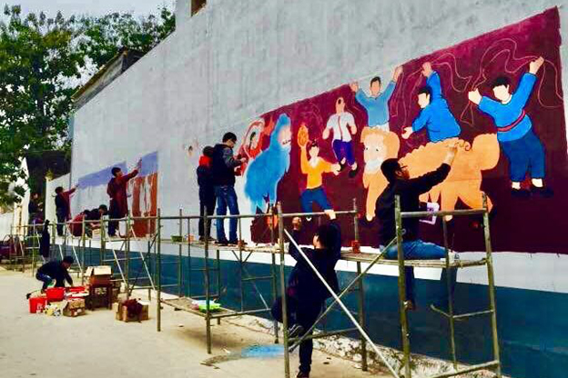 这次文化下乡活动由美术学院院长陈恩惠教授亲自带领,为期15天,共有2013级美术学、绘画专业24名同学参加,绘制了130余幅作品,面积达1200余平方米。文化墙绘内容以社会主义核心价值观、社会主义新农村村约家规、乡土人情为主要内容。这次活动是美术学院响应国家“美丽乡村”建设号召,是继赴长武县枣园镇、巨家镇文化下乡之后的又一个服务地方文化建设的惠民工程。通过师生们的精心绘制,有力的提升了三原县安乐镇蔡王村的文化面貌,对促进新农村文化建设具有重要意义。