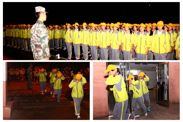 演练开始前,军训旅就演练的时间、路线、内容、具体操作程序、疏散要求等注意事项作了周密安排和详细讲解。晚上7:00,党委副书记李宗领宣布演练开始。各营连迅速带领学生从田径场有秩序地返回宿舍。随着地震警报发出,同学们就近躲避在床下、桌子下或承重墙根、墙角,用双臂或柔软物品护头,蜷缩身体,运用各种自救措施保护自己。一分钟后疏散信号发出,在连长的指挥下,同学们快速撤离到田径场。十五分钟后,各连队清点汇报人数完毕,整个疏散演练紧张迅速、有条不紊,达到了预期效果。