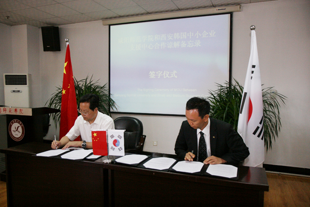 随后,汪生辉处长就我校学生和韩国留学生在韩企进行专业实习和就业、教师赴韩企参观学习、振兴公团西安代表处为我校招收韩国留学生提供支持和帮助、定期邀请韩国中小企业来我校举办学术讲座和招聘会等进行了细致深入的交流。经过商谈,双方达成共识并签订《咸阳师范学院和韩国中小企业支援中心关于交流活动合作谅解备忘录》,双方商定,将加强对话与沟通,互相交换信息,促进双方的交流与发展,并积极支持学生参加演讲、培训等多种交流活动,努力为学生搭建交流平台。同时,积极开展就业知识讲座、推荐韩企来我校开招聘会等,为学生就业创造机会。振兴公团西安代表处为我校图书馆捐赠《韩汉汉韩词典》《商务韩国语》《韩国旅游指南》(中文版)等图书共计320本。
