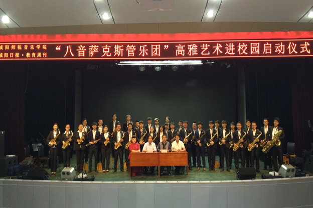 为了丰富咸阳市中小学学生课外文化生活、提高我校学生服务社会的意识和实践能力、进一步扩大我校社会影响、密切校地关系,5月15日,我校音乐学院“八音萨克斯乐团”与《咸阳日报.教育周刊》联合举办“高雅音乐进校园”公益活动启动仪式在我校举行,启动仪式由“八音萨克斯乐团”艺术总监沙勇主持,《咸阳日报.教育周刊》总编王永杰、音乐学院党委书记刘连新、院长王勇华出席启动仪式。该公益活动将于近期面向全市中小学免费演出。