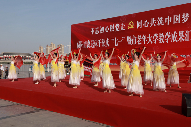 6月22日,由离退休工作处组织,我校老年大学舞蹈班学员,以不忘初心跟党走的信念,以同心共筑中国梦的情怀,精心编排,满怀激情地在咸阳市统一广场,参加了咸阳市离退休干部庆“七一”暨市老年大学教学成果汇报展演。